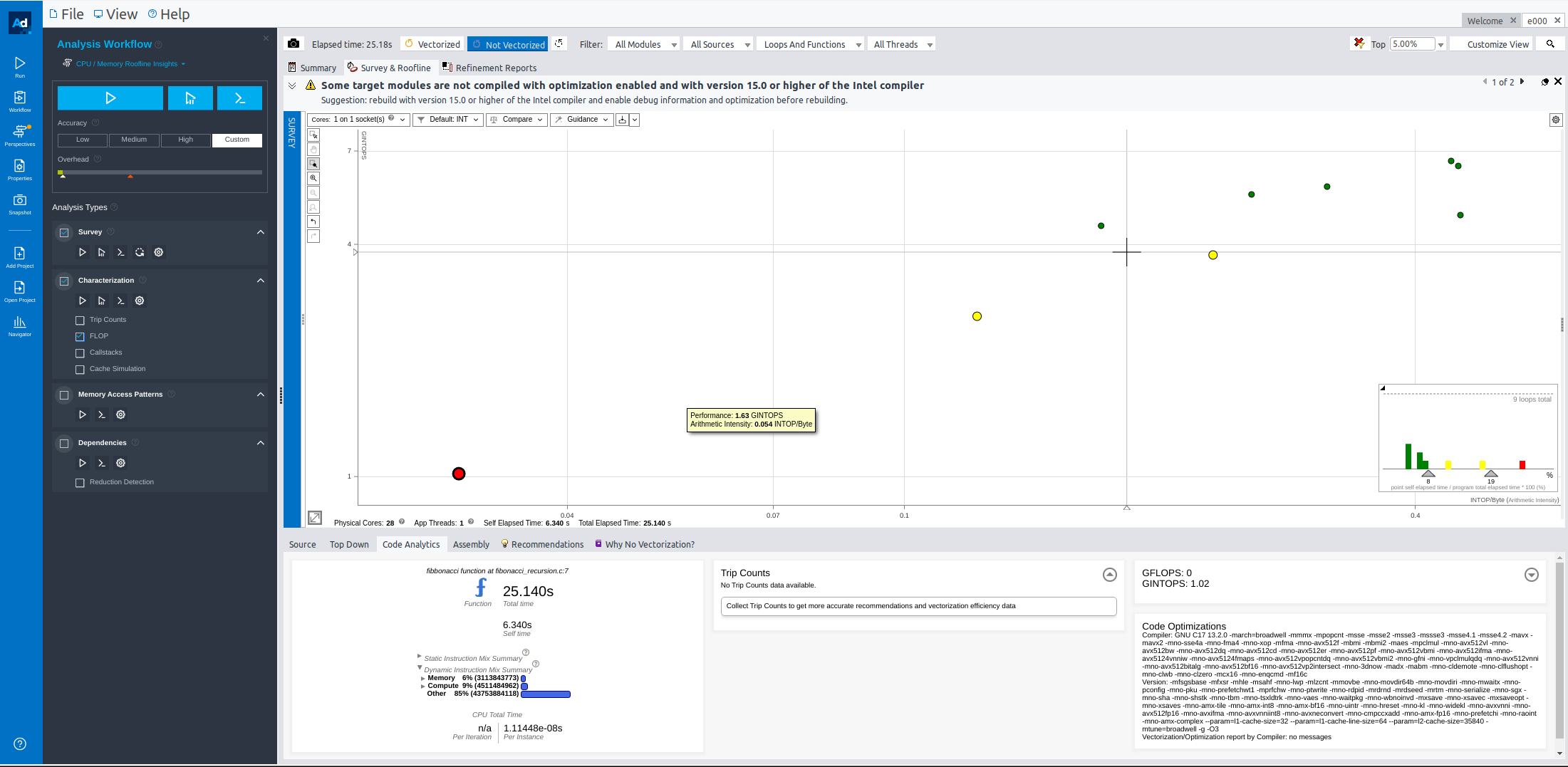 Use the code example in the Advisor section and collect results for the Fibonacci number 50. Then, in the Advisor GUI, obtain the GFLOPS and GINTOPS in the Code Analytics tab.
