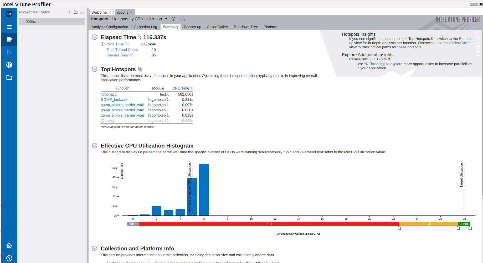 Use the code provided in the VTune section and run the code with 8 threads for the Fibonacci number 56. Use the VTune GUI to obtain the Elapsed Time, and the Top Hotspots in the Summary tab.