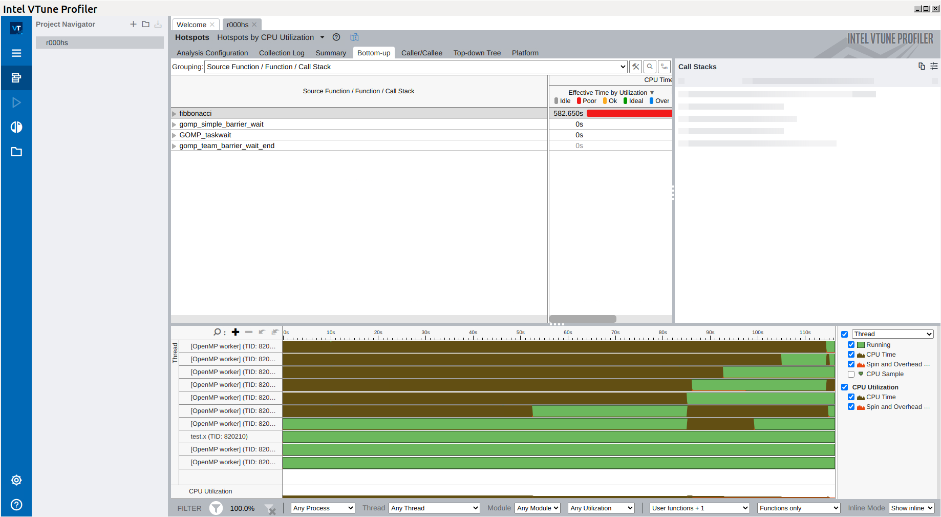 In the plot at the bottom one can see the CPU Utilization for each Thread. The CPU Time shows when the threads are doing some work, otherwise they are idle. Ideally, the plot would show brown bars denoting fully occupied threads. How does this plot look for the present code? Do the behavior of the individual threads explain the Effective Time by Utilization above?